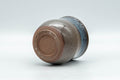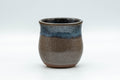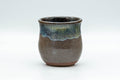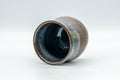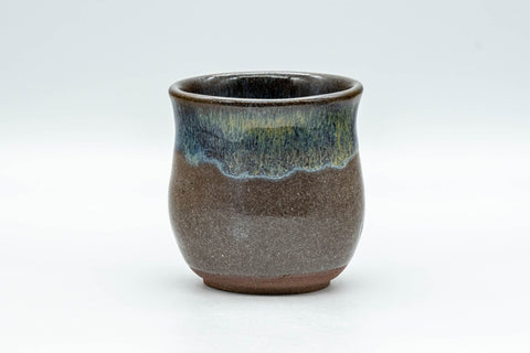 This curvy yunomi (teacup) features a brown glazed exterior and a sleek blue and yellow hare's fur glaze around its rim.