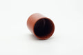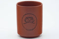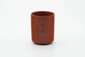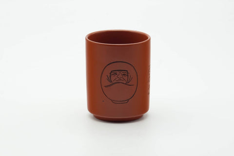 This tsutsu-gata Tokoname-yaki yunomi (teacup) features unglazed dark red shudei clay engraved with kanji and a daruma.