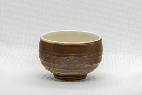 This yunomi (teacup) features an earthy brown exterior and a white glazed interior. This white glazing lets you see the true colour of the tea. Stamped Raku (楽).