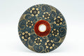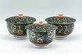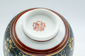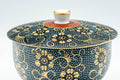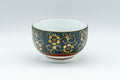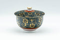 This lidded Kutani-yaki yunomi (teacup) features an Aochibu blue dot and golden flower pattern. Lidded teacups are traditionally used to keep the heat in and the dust out.