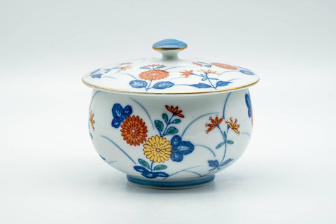 This Arita-yaki lidded yunomi (teacup) is decorated with red flowers and blue leaves.