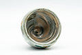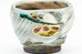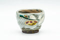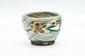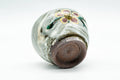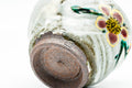 This wabi-sabi guinomi (small teacup) features a grey and white brush glaze decorated with flowers.