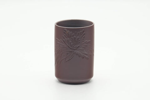 This tsutsu-gata Banko-yaki yunomi (teacup) features a beautifully engraved floral motif.