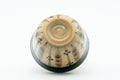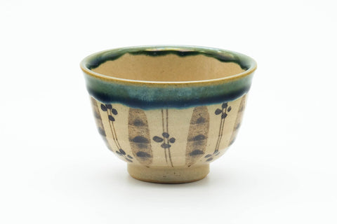 This Oribe-yaki guinomi (small teacup) features a beige and green drip-glaze around its lip with floral and geometric motifs