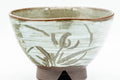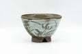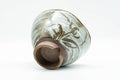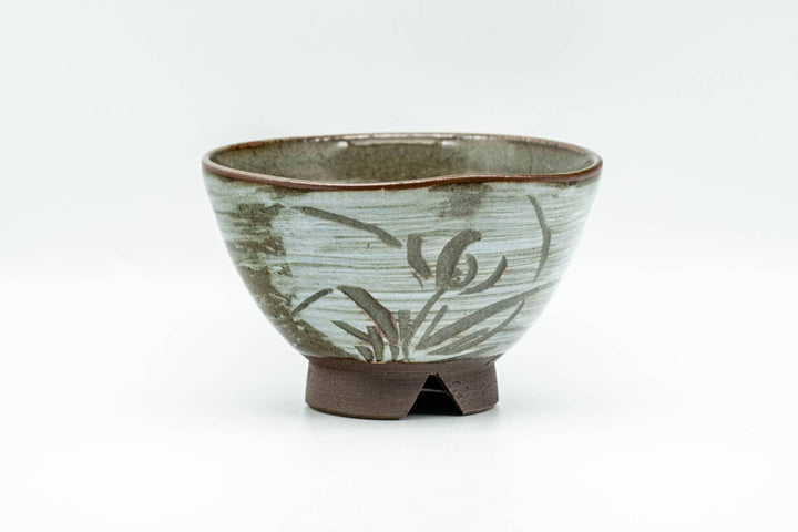This yunomi (teacup) features thin, tulip-shaped clay walls. Its grey glaze is decorated with flowers and a white hakeme brush stroke pattern.