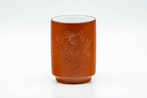 This Tokoname-yaki yunomi (teacup) features a beautifully engraved floral decoration, kanji, and a white inner-glaze.