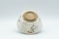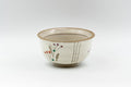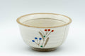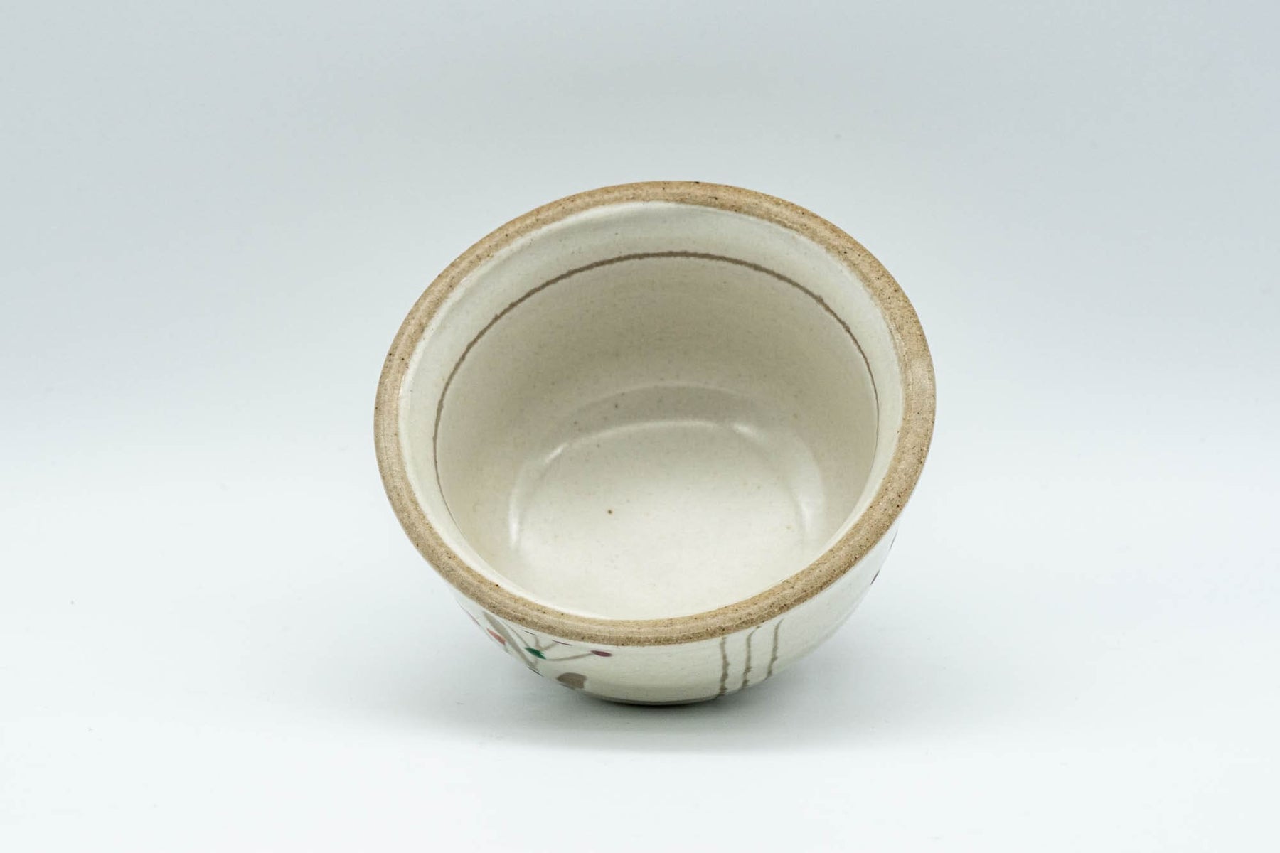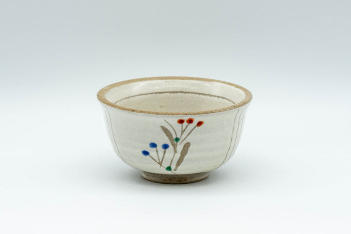 This guinomi (small teacup) features a white glaze and painted red and blue flowers