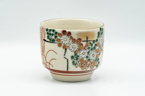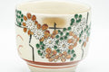 This Kutani-yaki yunomi (teacup) features a beige glaze decorated with beatiful gold, red and white flowers.