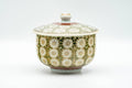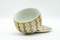 This Kutani-yaki lidded yunomi (teacup) is beautifully decorated with gold, yellow, and chrysanthemum tessellations.