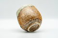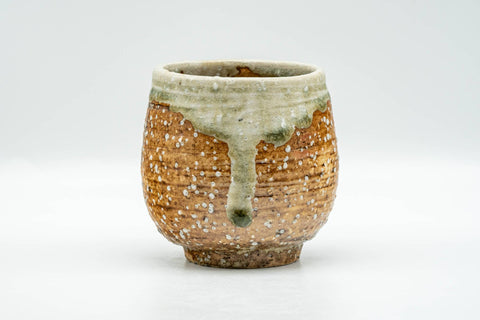 This large yunomi (teacup) features a textured brown clay decorated with an ash green drip-glaze.