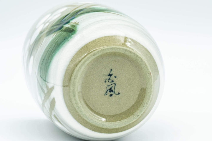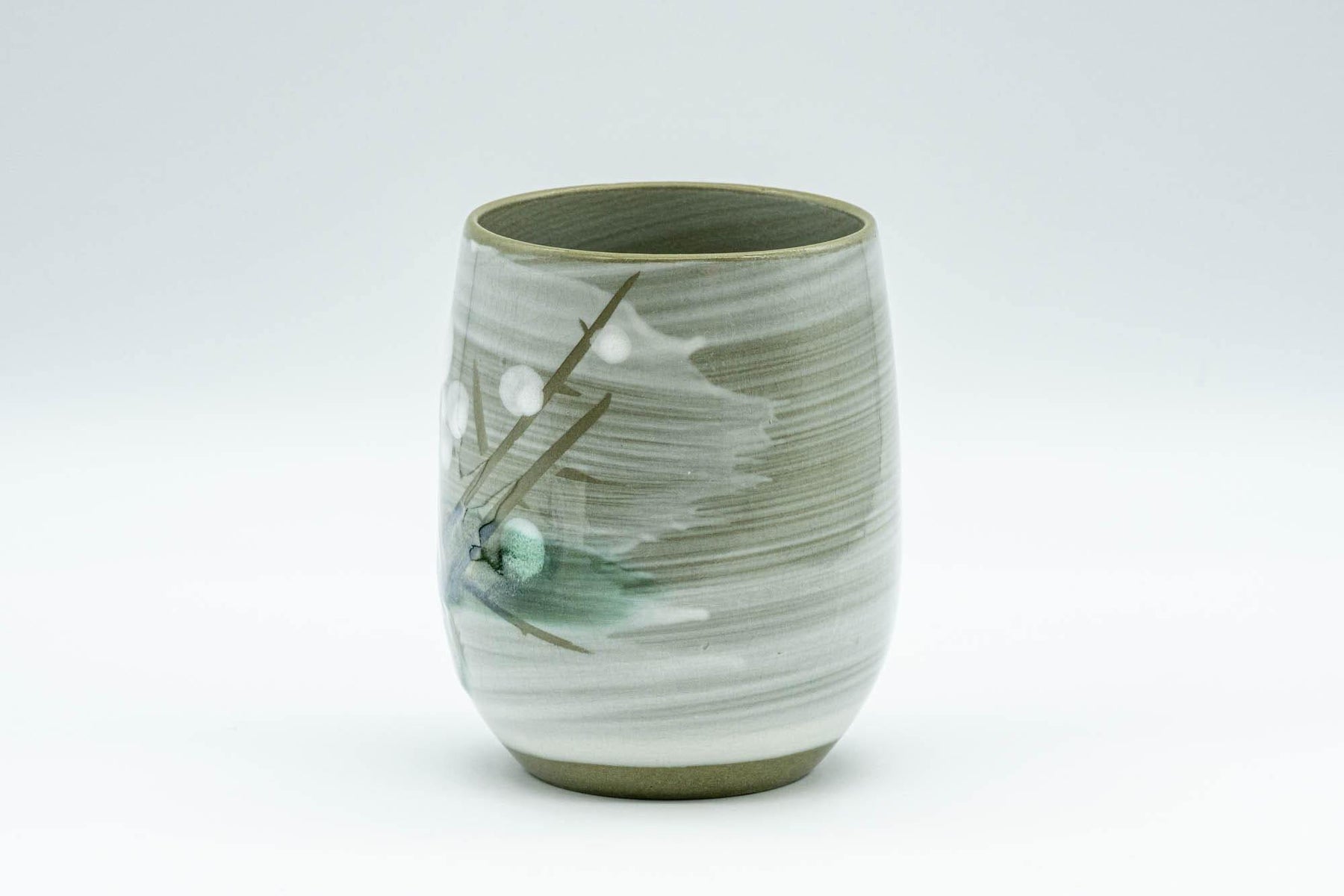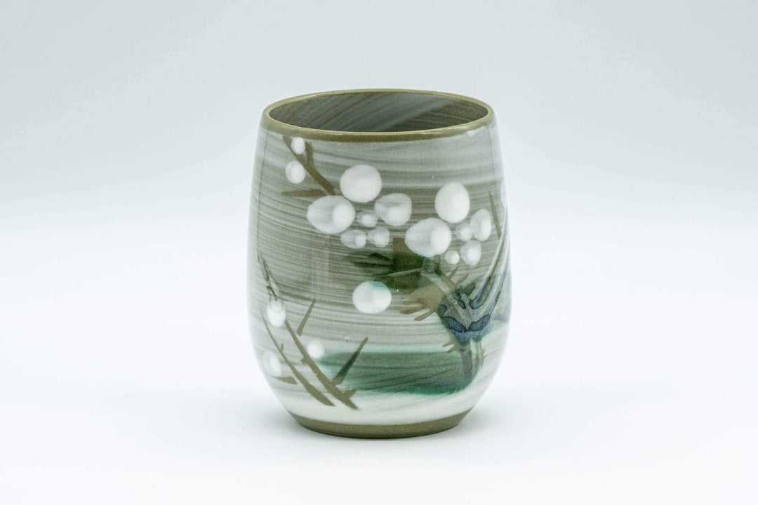 This green yunomi (teacup) features a brushed white overglaze and is decorated with hand-painted flowers.