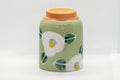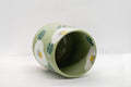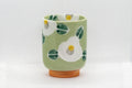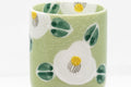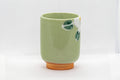 This tsutsu-gata (cylindrical) yunomi (teacup) features a crazed green glaze and is decorated with white camellias.