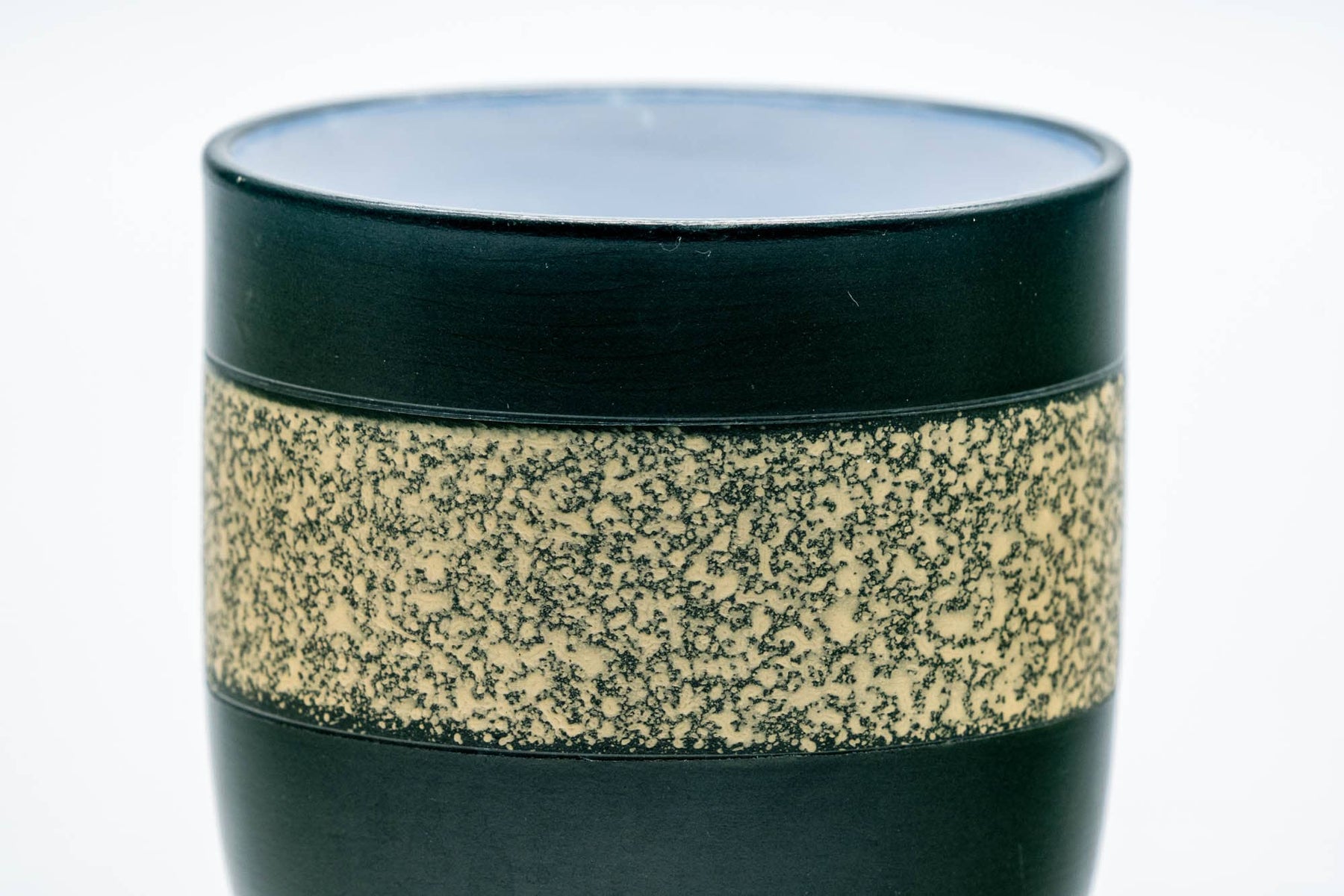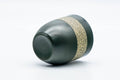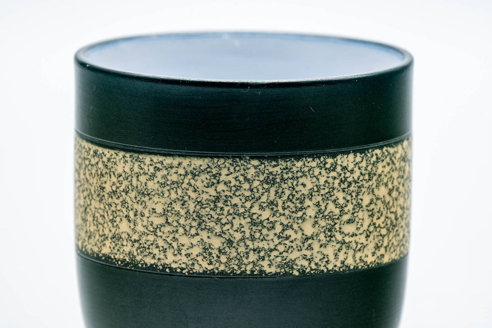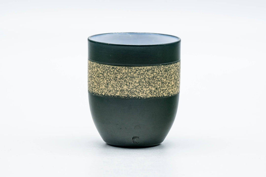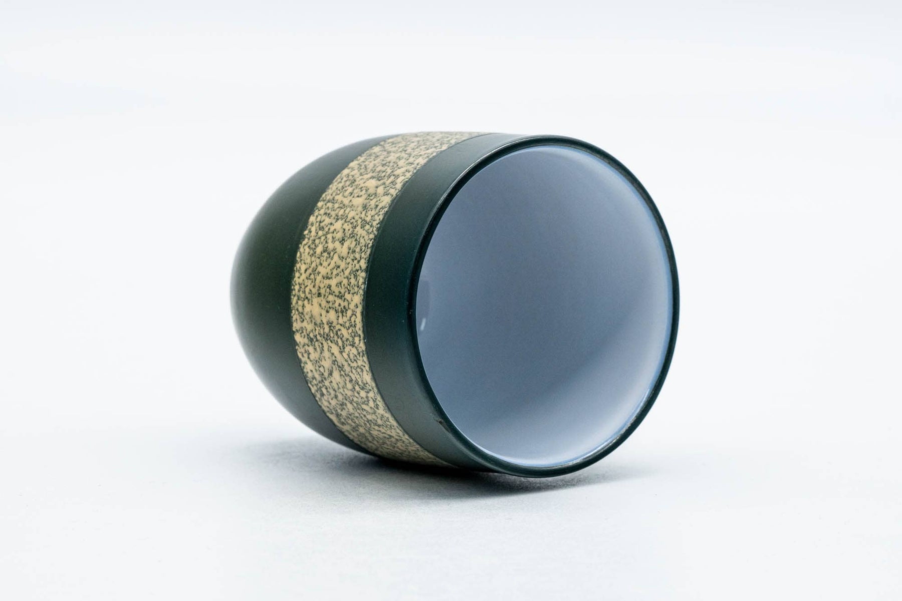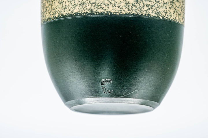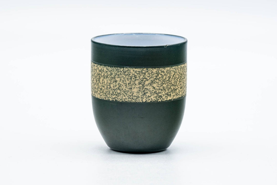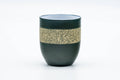 This green Tokoname-yaki yunomi (teacup) is decorated with a band of mottled yellow glaze and feature a blue-glazed interior. The green clay, called ryokudei, gets its colour from its high cobalt content.