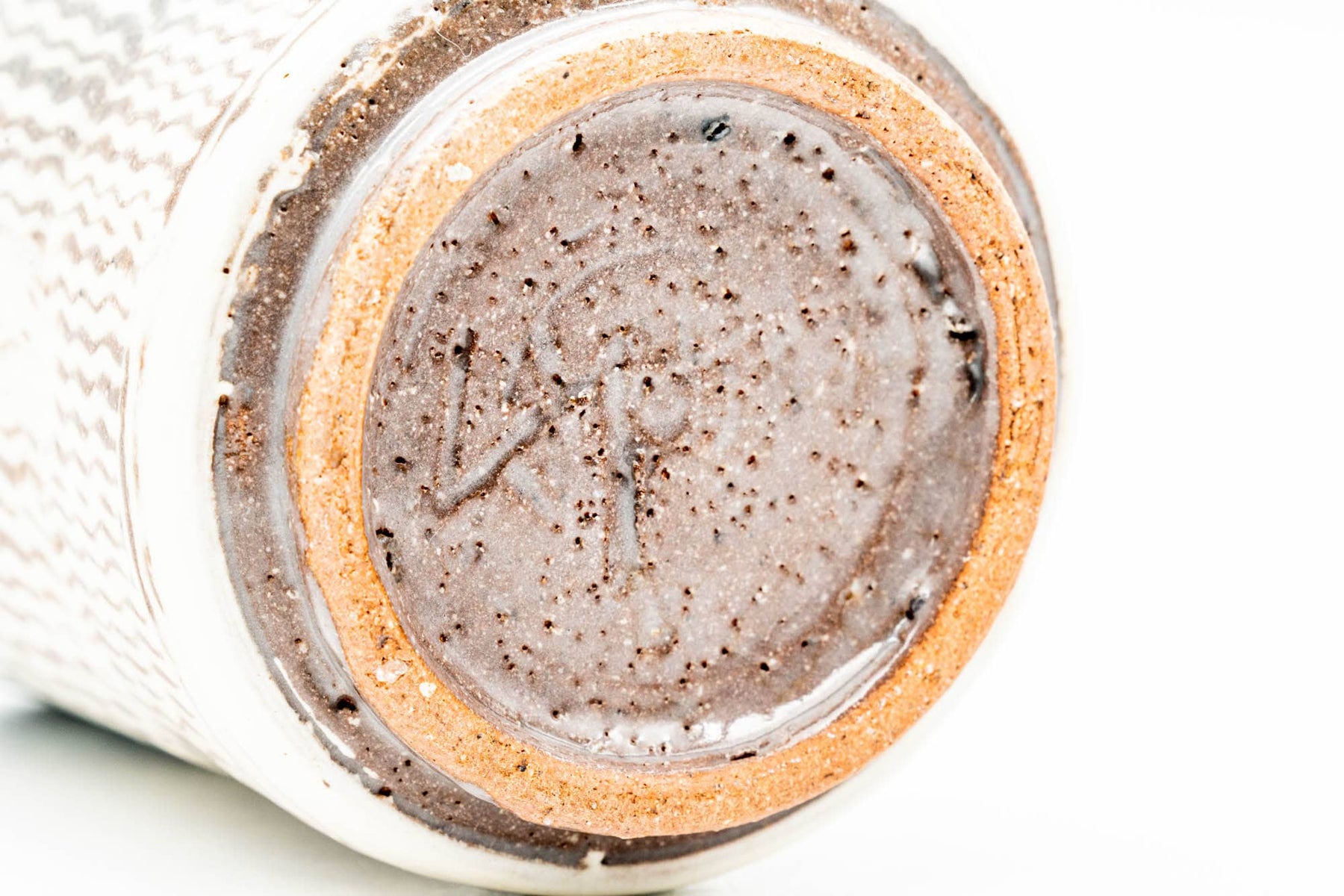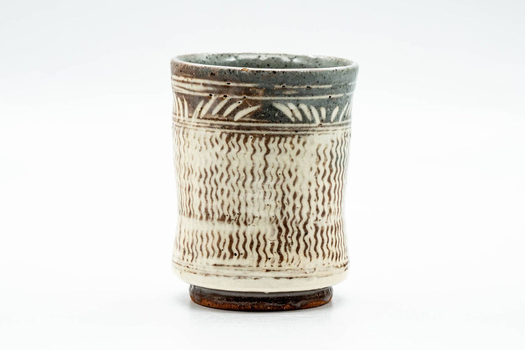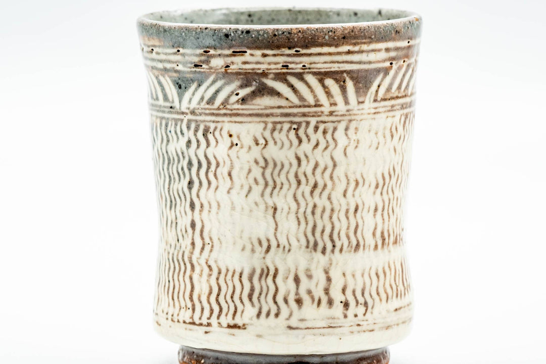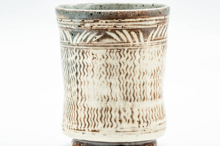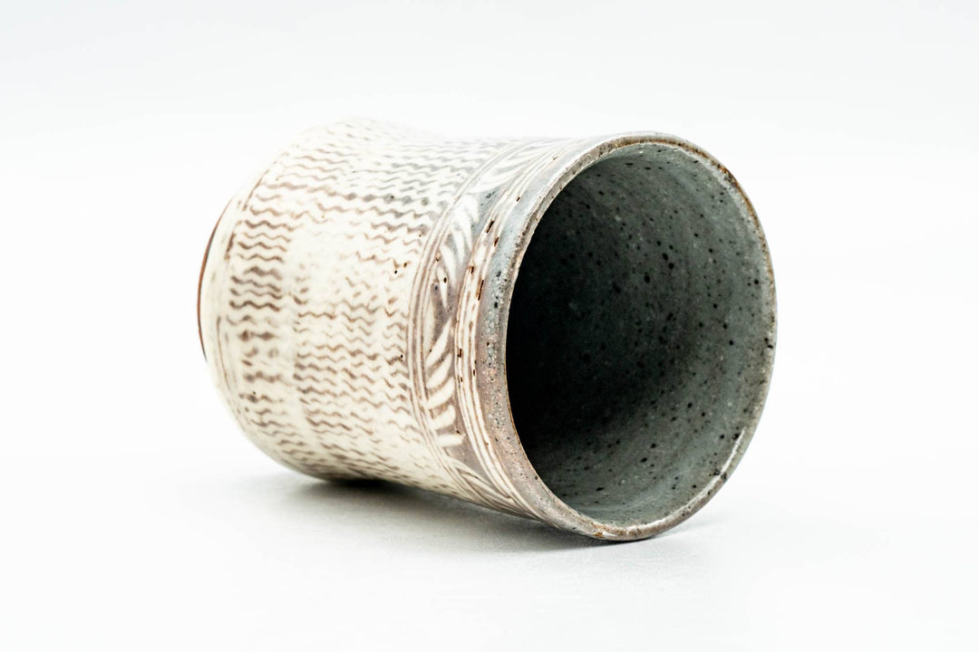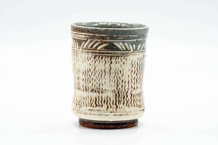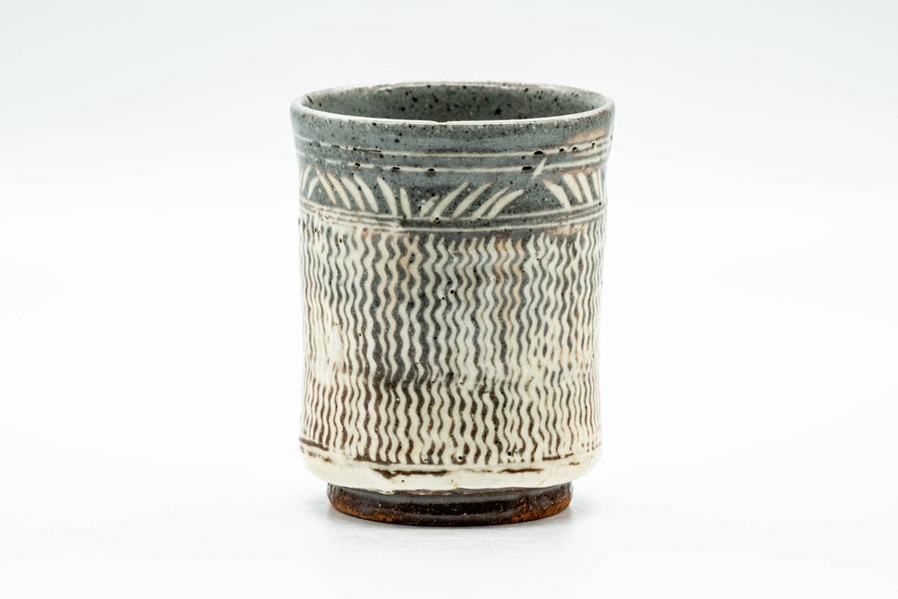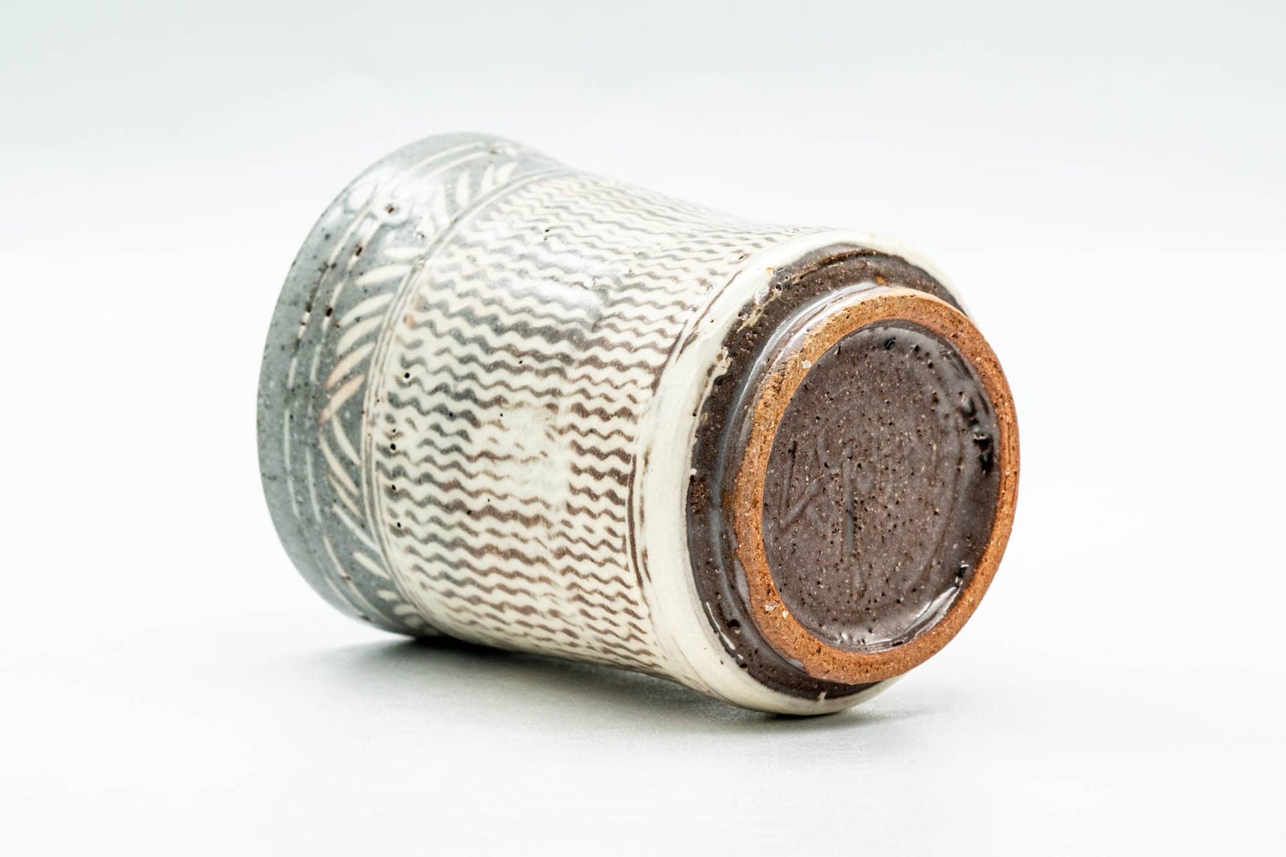 This wabi-sabi yunomi (teacup) features a grey and white glaze decorated with abstract geometric motifs