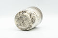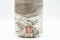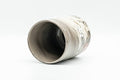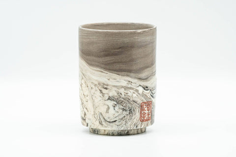 This tsutsu-gata yunomi (teacup) features a sleek marbled grey and white pattern decorated with kanji