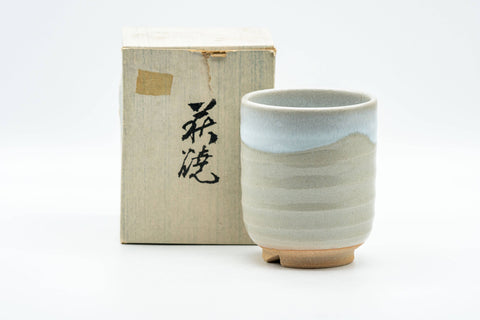 This elegant tsutsu-gata Hagi-yaki yunomi (teacup) features a crazed grey glaze with white around the lip.