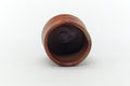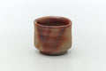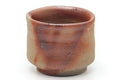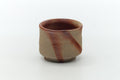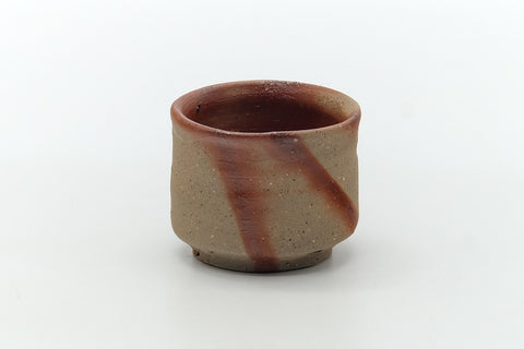 This light brown and orange Bizen-yaki yunomi (teacup) is decorated with the hidasuki (緋襷) pattern. This traditional decoration is created when the potter wraps rice straw around a piece before placing it into the kiln, where the alkalines in the straw react with iron in the clay body to produce these striking scarlet burn marks.