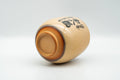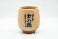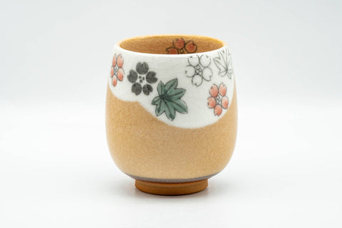 This large yunomi (teacup) features an orange celadon glaze decorated with flowers and kanji.