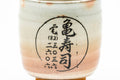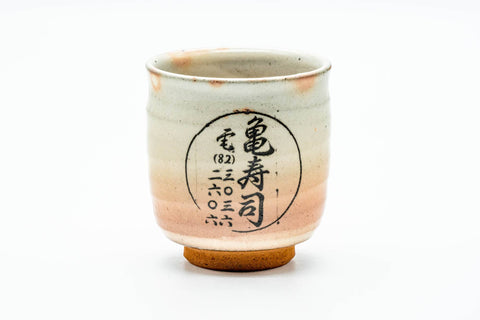 This large Hagi-yaki yunomi (teacup) features a beige and pink glaze decorated with kanji.