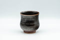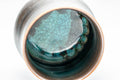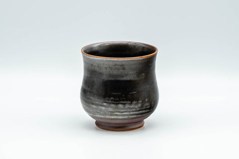 This curvy yunomi (teacup) features a metallic grey glaze and a stunning crazed cerulean blue ash glaze deposit at the bottom of the cup's interior.
