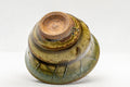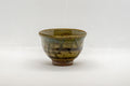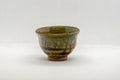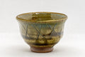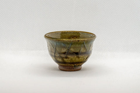 This guinomi (small cup) features a flared lip, a moss green glaze, and a cross-hatching design.