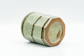 This yunomi (teacup) features faceted octagonal walls decorated with abstract swirls over a sage green glaze.