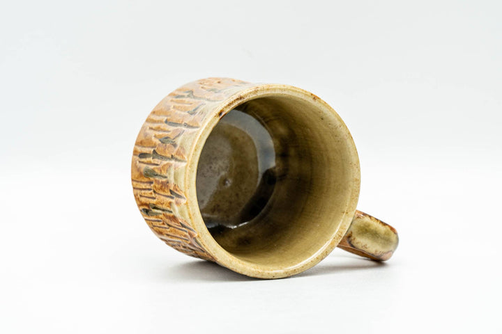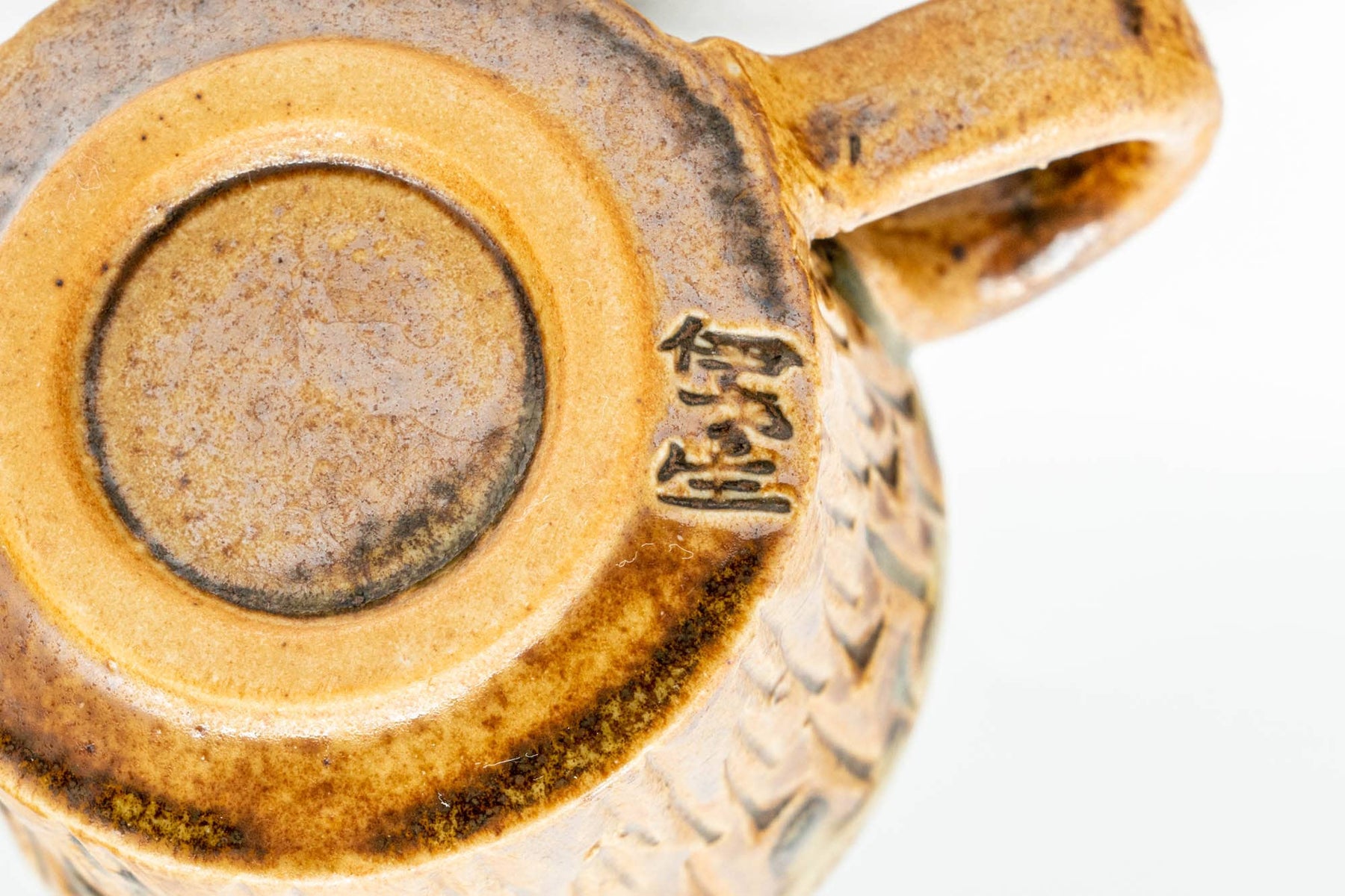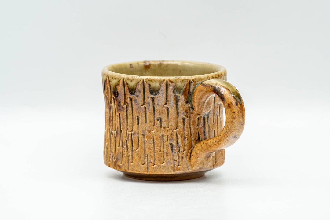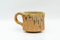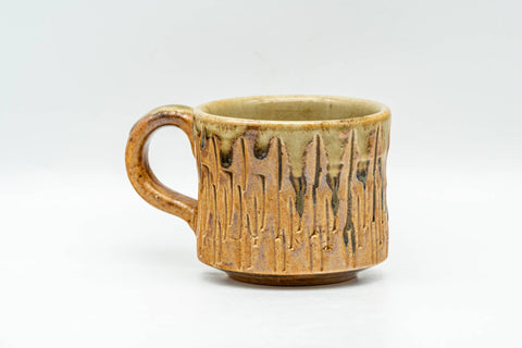 This ushirode yunomi (small rear-handled teacup) features a hand-sculpted clay body decorated with an orange and green drip-glaze