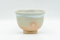 This Hagi-yaki yunomi (teacup) features a beige glaze decorated with pink spots, called gohonte, and a white drip-glaze.