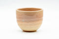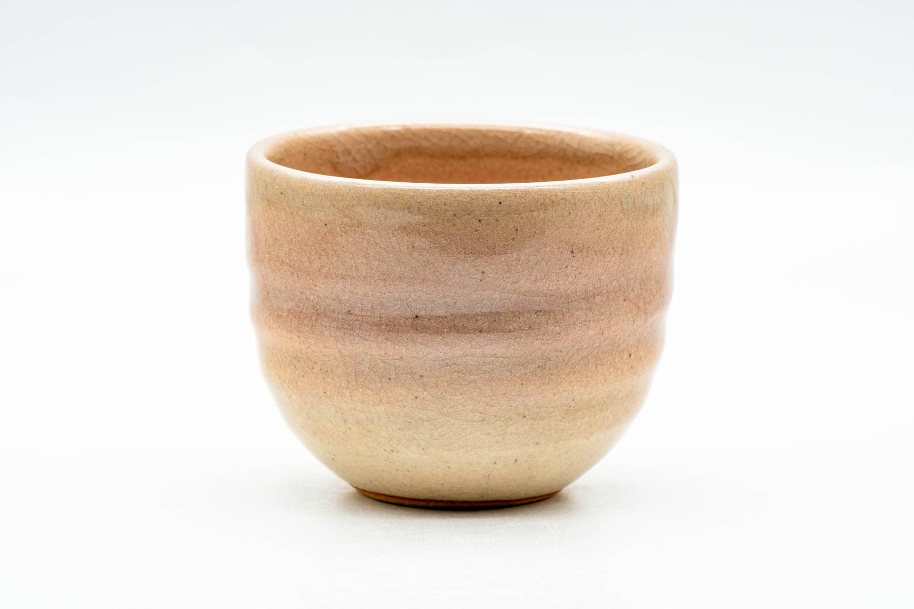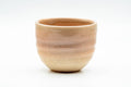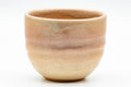 This Hagi-yaki yunomi (teacup) features a spiraling clay body, flat foot, and a sleek pink toned glaze.