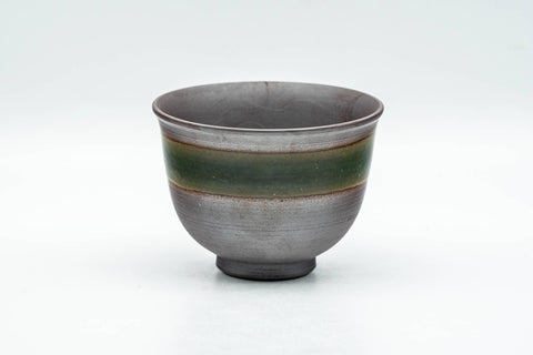 This small Banko-yaki yunomi (teacup) features a purple clay body and a horizontal stripe of green glaze surrounding its exterior, and a white glaze at the base of its interior.