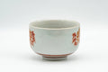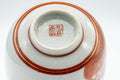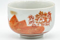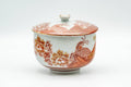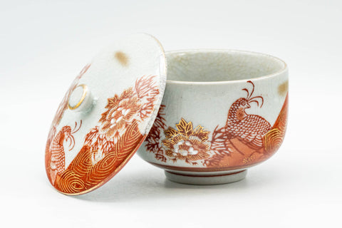 This Kutani-yaki lidded yunomi (teacup) is decorated with red peacocks outlined with gold. The cup's lid helps keep dust out and heat in.