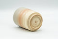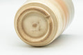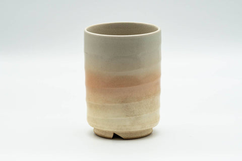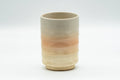 This tsutsu-gata Hagi-yaki yunomi (teacup) features a ribbed design with a beige and peach gradient glaze.