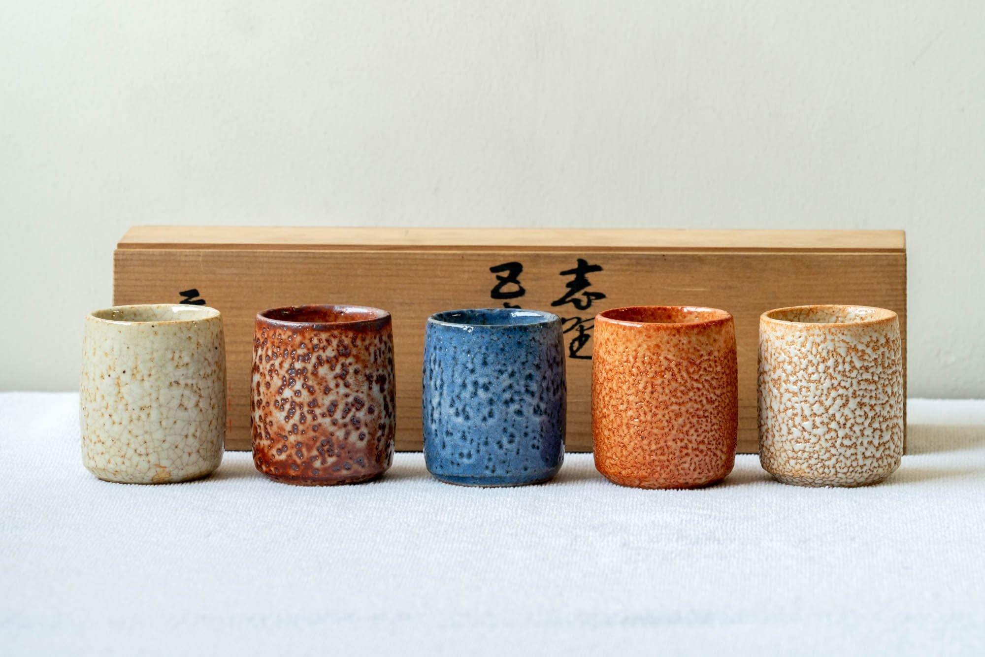 This set of five tsutsu-gata yunomi (teacups) each feature their own uniquely colored shino glaze, from cream to red to blue to orange and beige shino glaze.