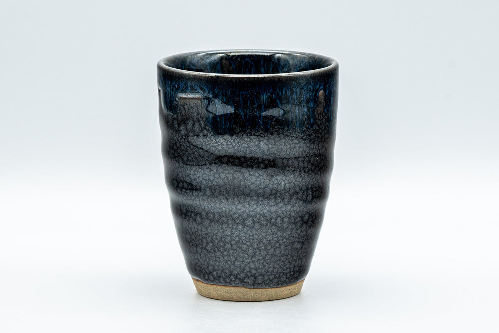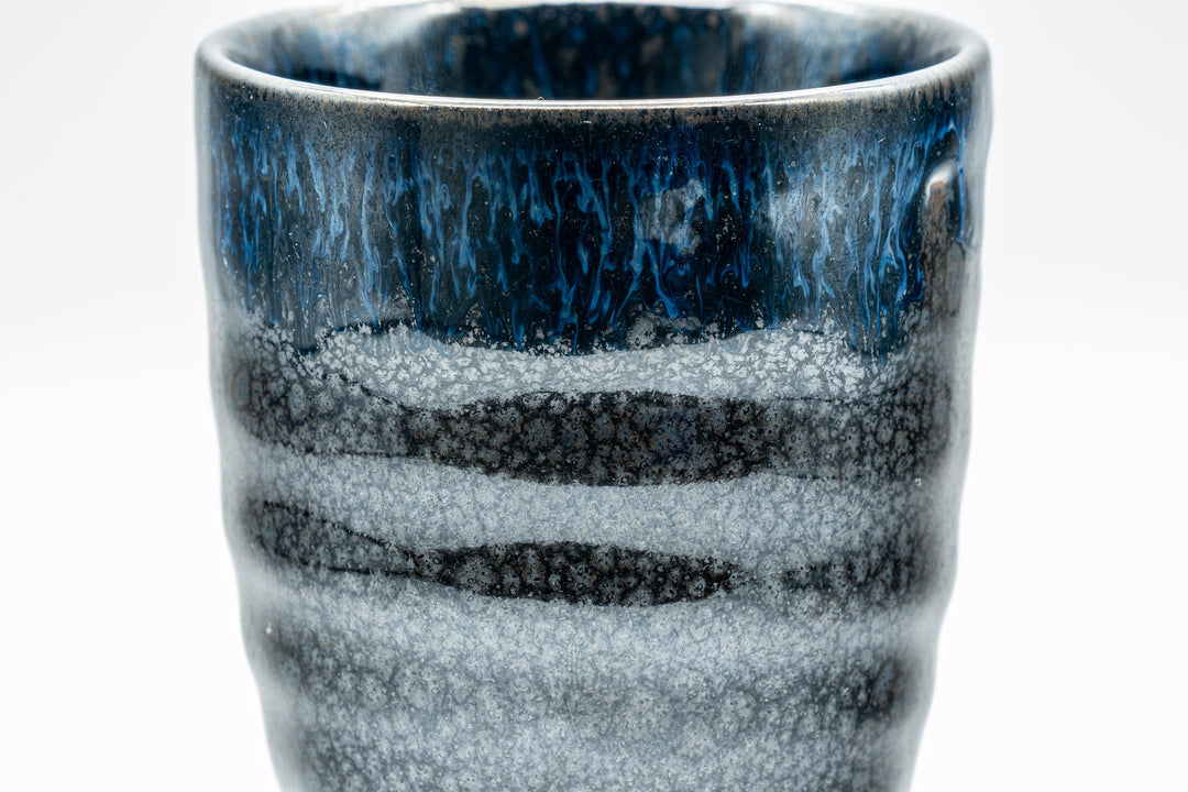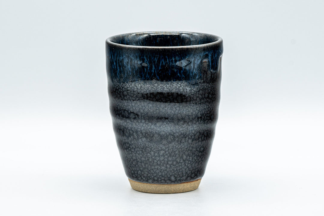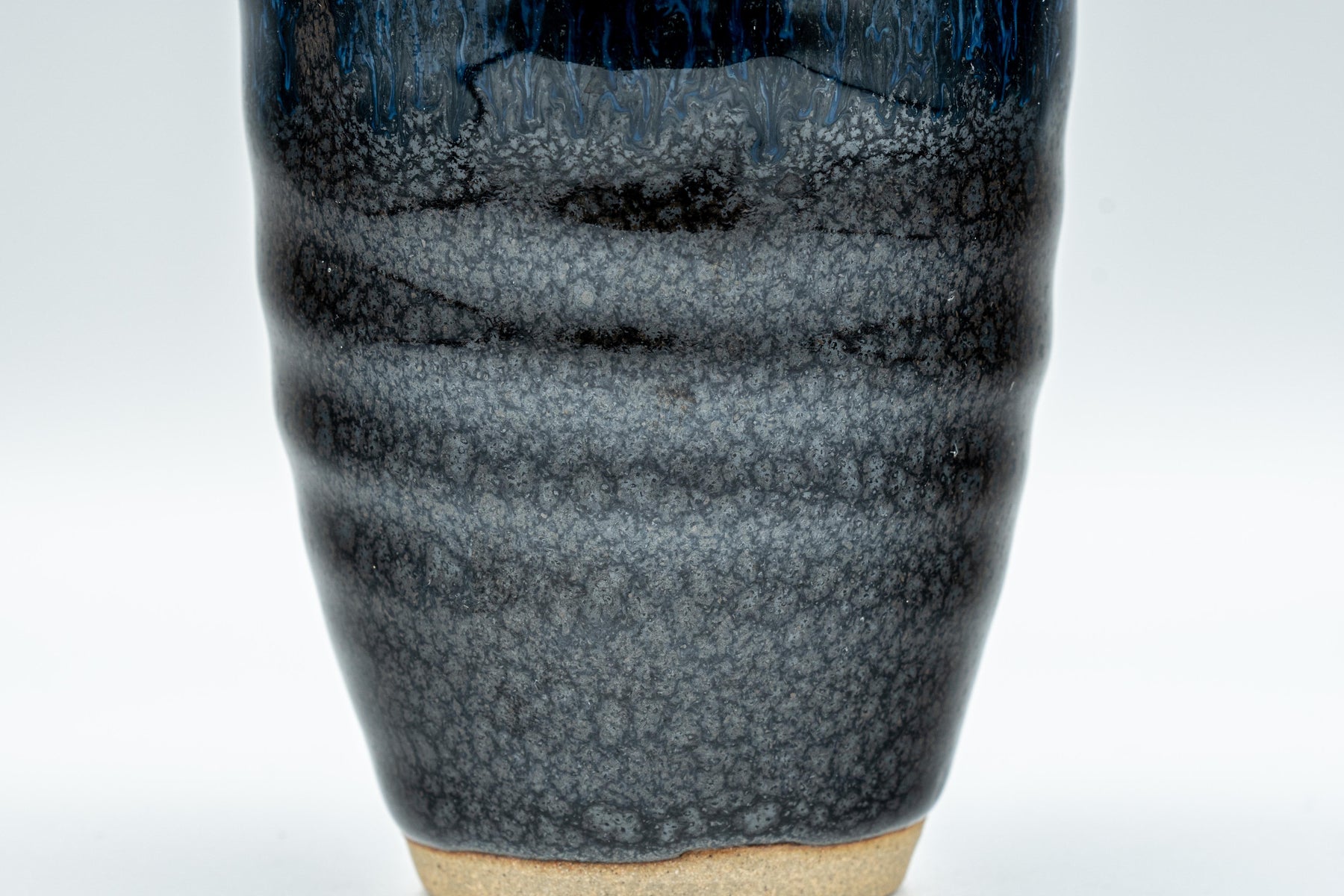 This tall yunomi (teacup) features a stunning yuteki (oil spot) tenmoku glaze accented by a dazzling cerulean blue drip glaze around the lip.