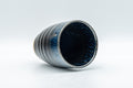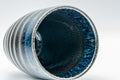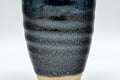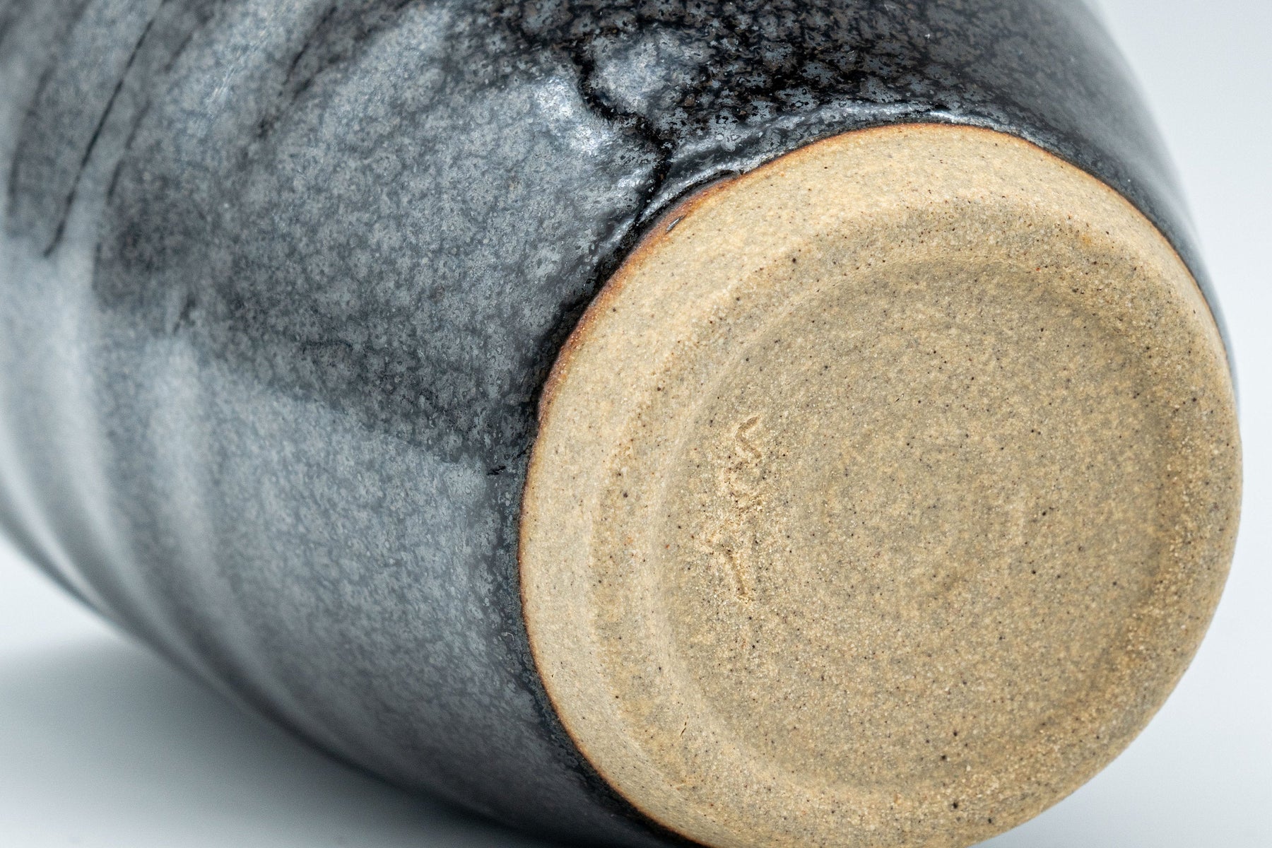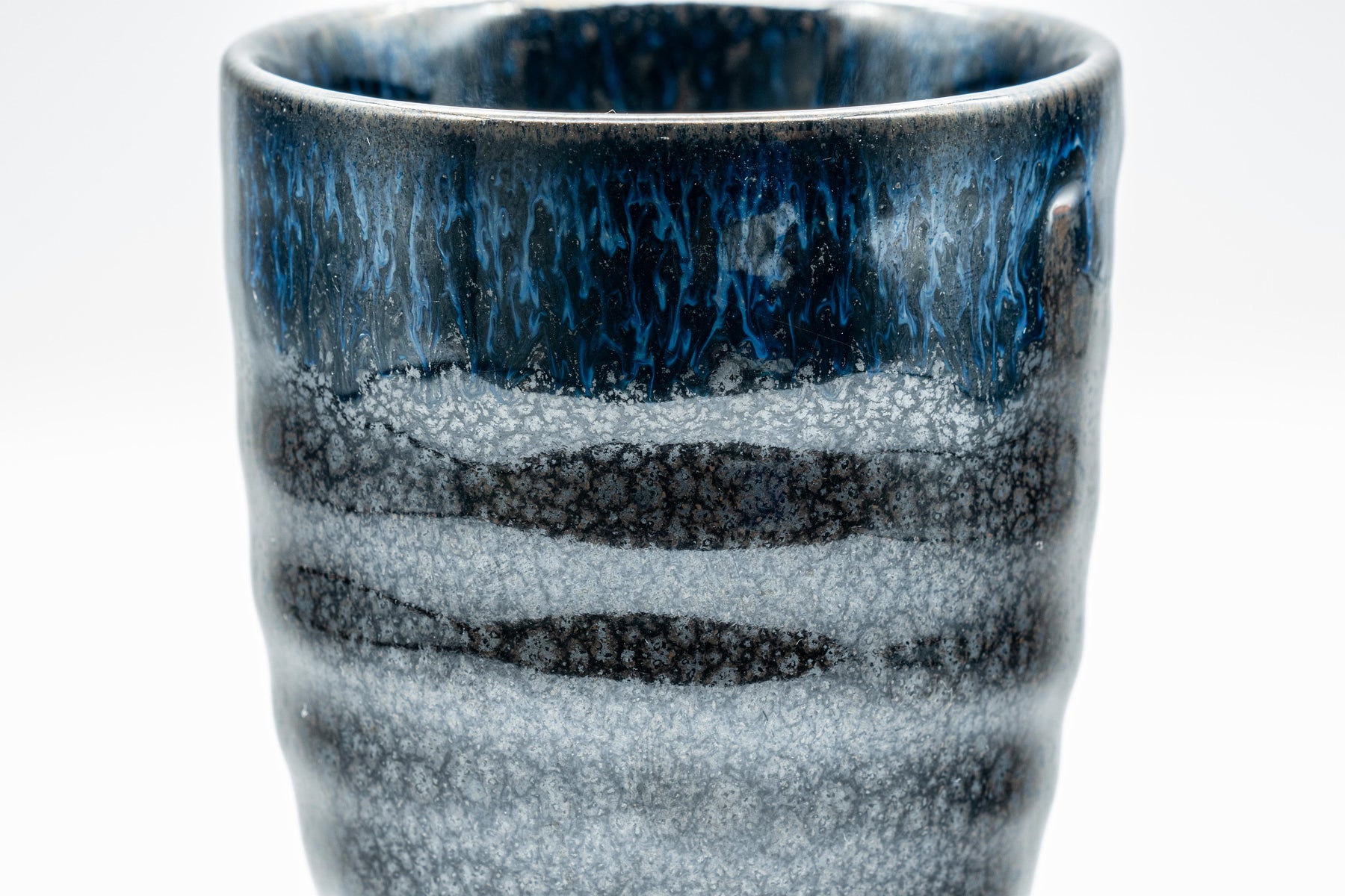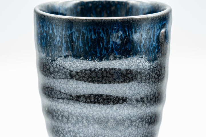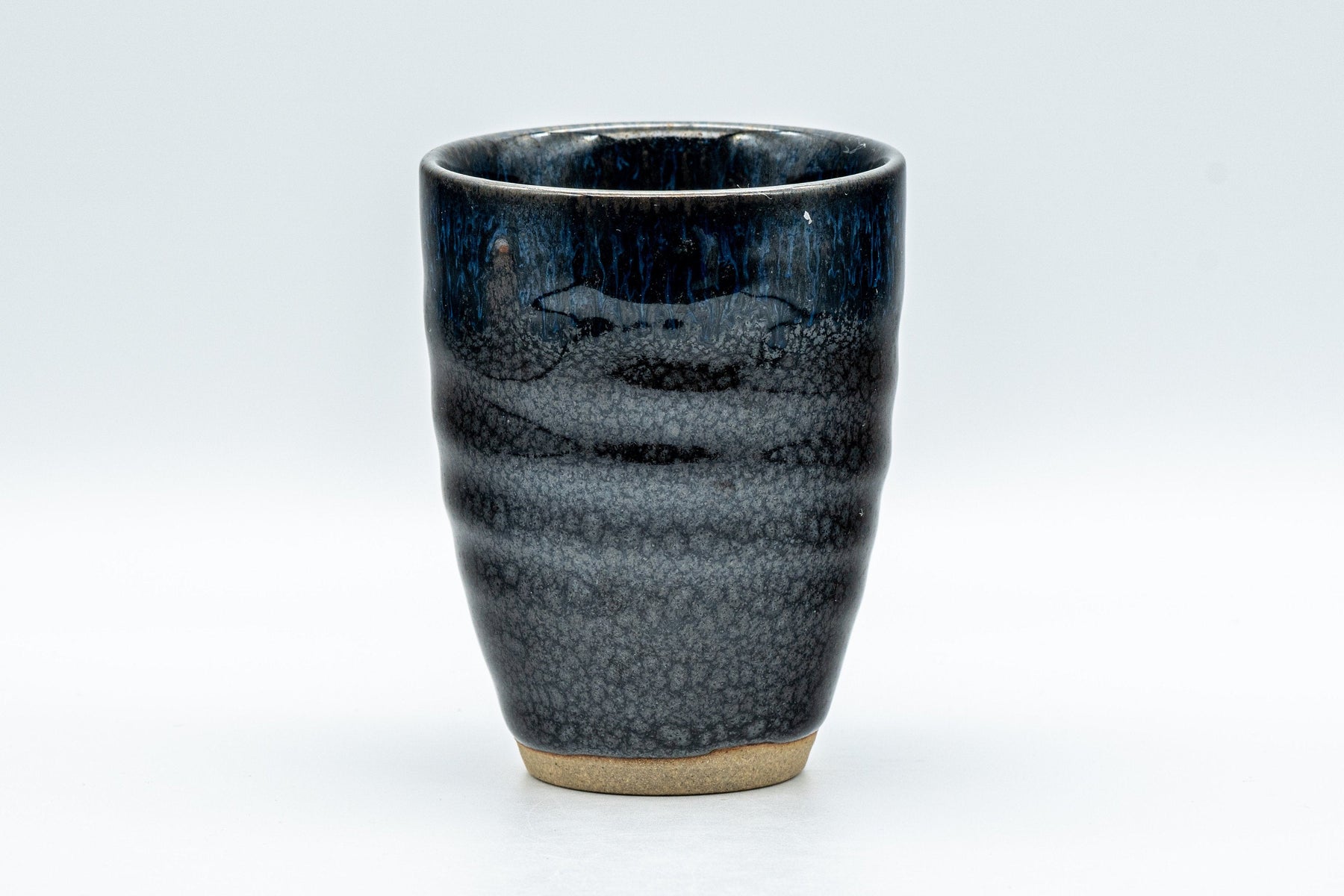 This tall yunomi (teacup) features a stunning yuteki (oil spot) tenmoku glaze accented by a dazzling cerulean blue drip glaze around the lip.