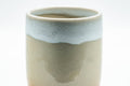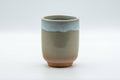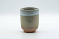 This tsutsu-gata Hagi-yaki yunomi (teacup) features a finely crazed grey glaze with a white glaze around the lip. Made by Tsubaki Kiln (椿窯, stamped 天鵬山).
