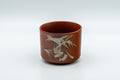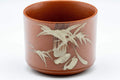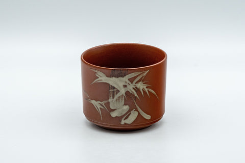 This tsutsu-gata Tokoname-yaki yunomi (teacup) is decorated with a white slip painting of bamboo leaves. Made by 亮泉 朱泥 (Ryosen Azuchi).