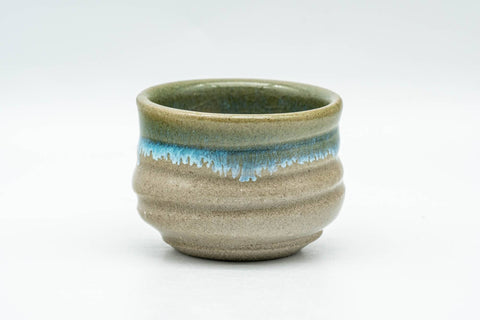This Agano-yaki guinomi (small teacup) features a turquoise drip-glaze and a spiraling clay body.