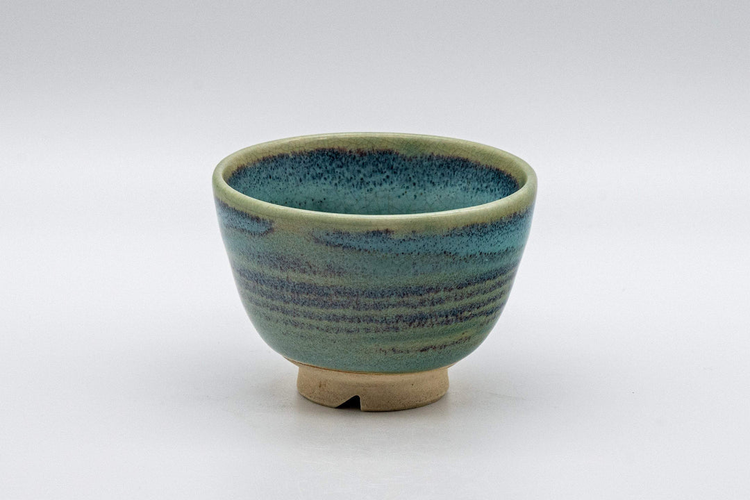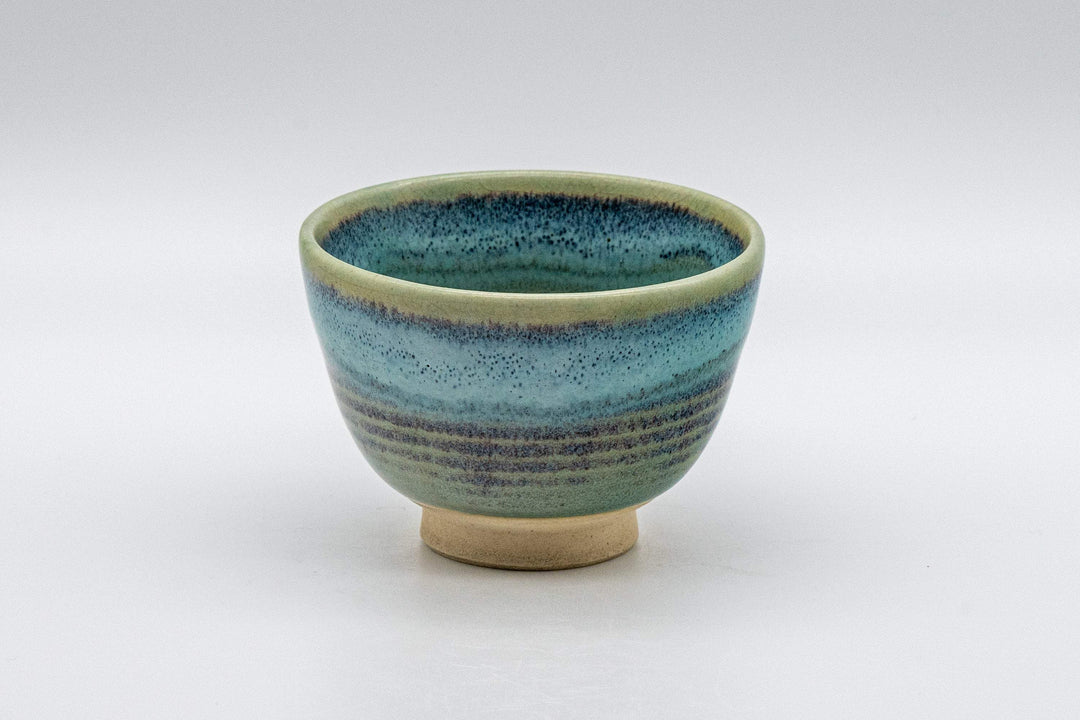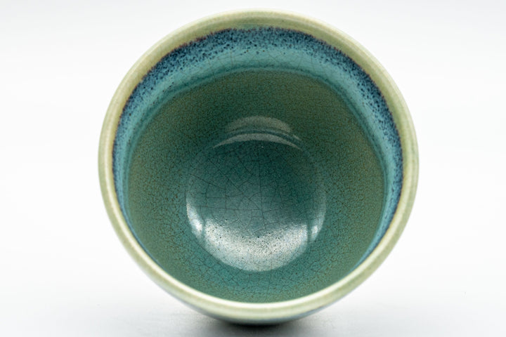 This wan-nari yunomi (teacup) features a stunning turquoise hare's fur glaze over a crazed green glaze.
