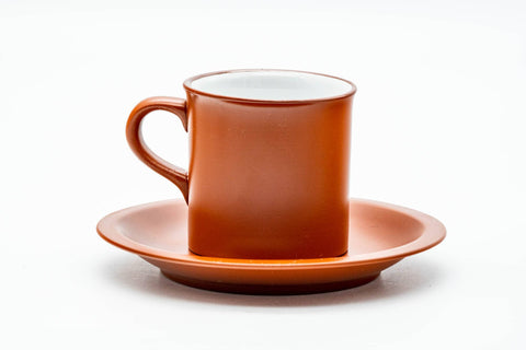 This classy Tokoname-yaki ushirode yunomi (rear-handled teacup) comes with a matching ceramic chataku tea saucer, and features an unglazed red shudei exterior and a white inner-glazed interior.