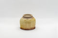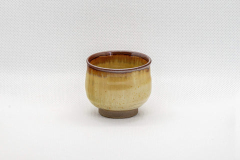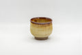 This tulip shaped guinomi (small cup) features a speckled yellow-gold glaze with orange-brown lip