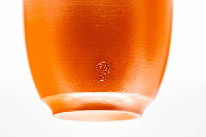 This set of four Tokoname-yaki yunomi (teacups) features a red shudei exterior decorated with ume plum blossoms and a white interior-glaze. Made by 弘洋 Kouyou.