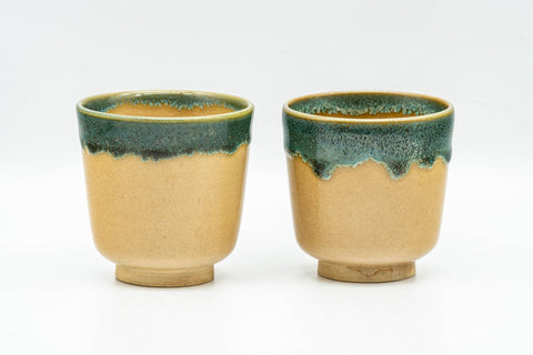 This pair of Agano-yaki yunomi (teacups) feature a beige glazed body and turquoise drip-glaze over their lips.