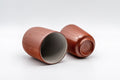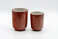 This couple's pair of elegant tall tsutsu-gata yunomi (teacups) feature a red glazed exterior decorated with an engraved bird, and a white glazed interior. Called 'meoto yumomi' in Japanese, couple's pairs of teacups are traditional wedding gifts.