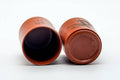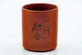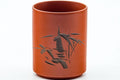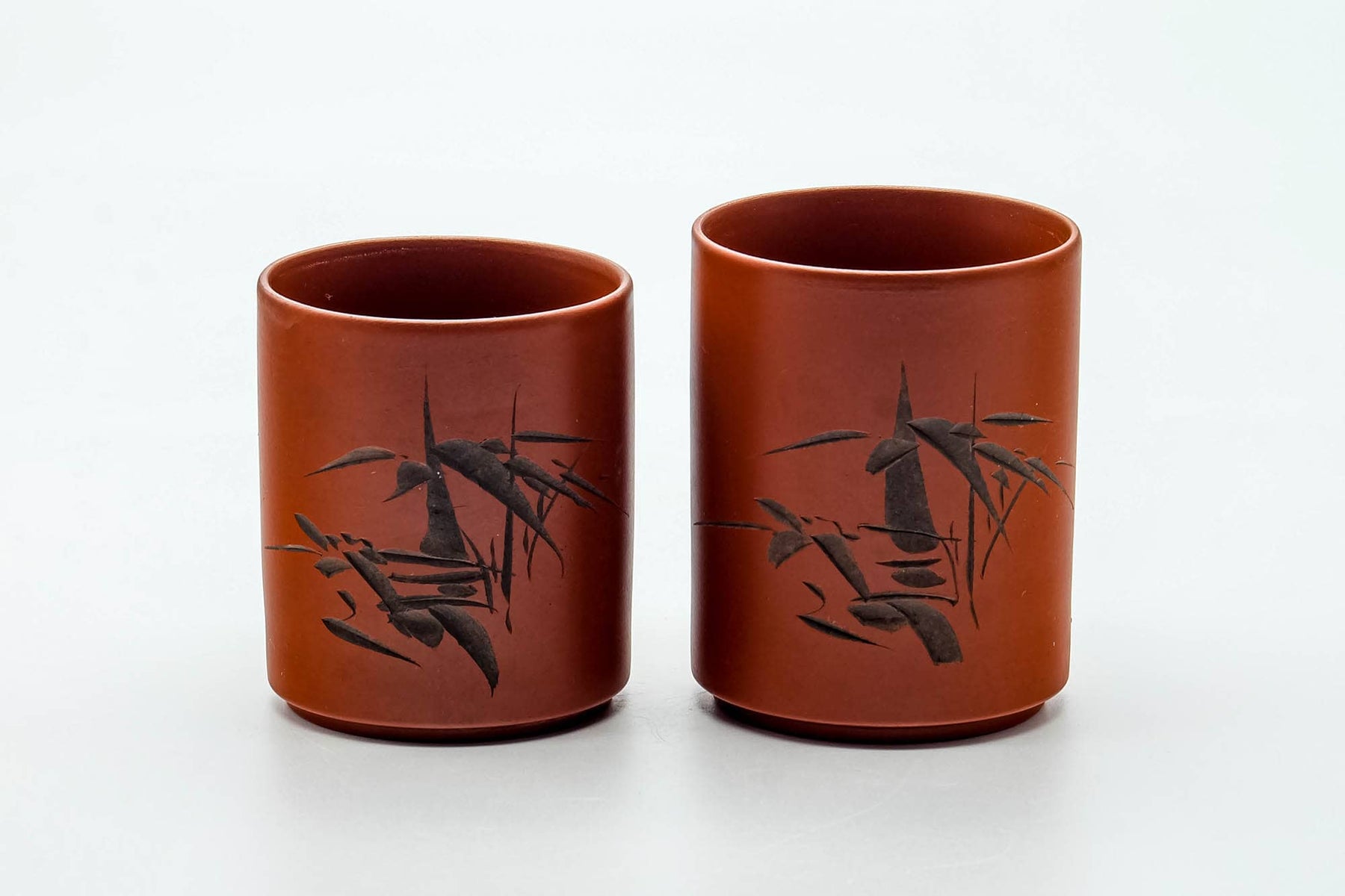 This pair of Tokoname-yaki meoto yunomi (teacups) are made from smooth red shudei clay and engraved with bamboo motifs and calligraphy.