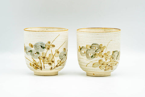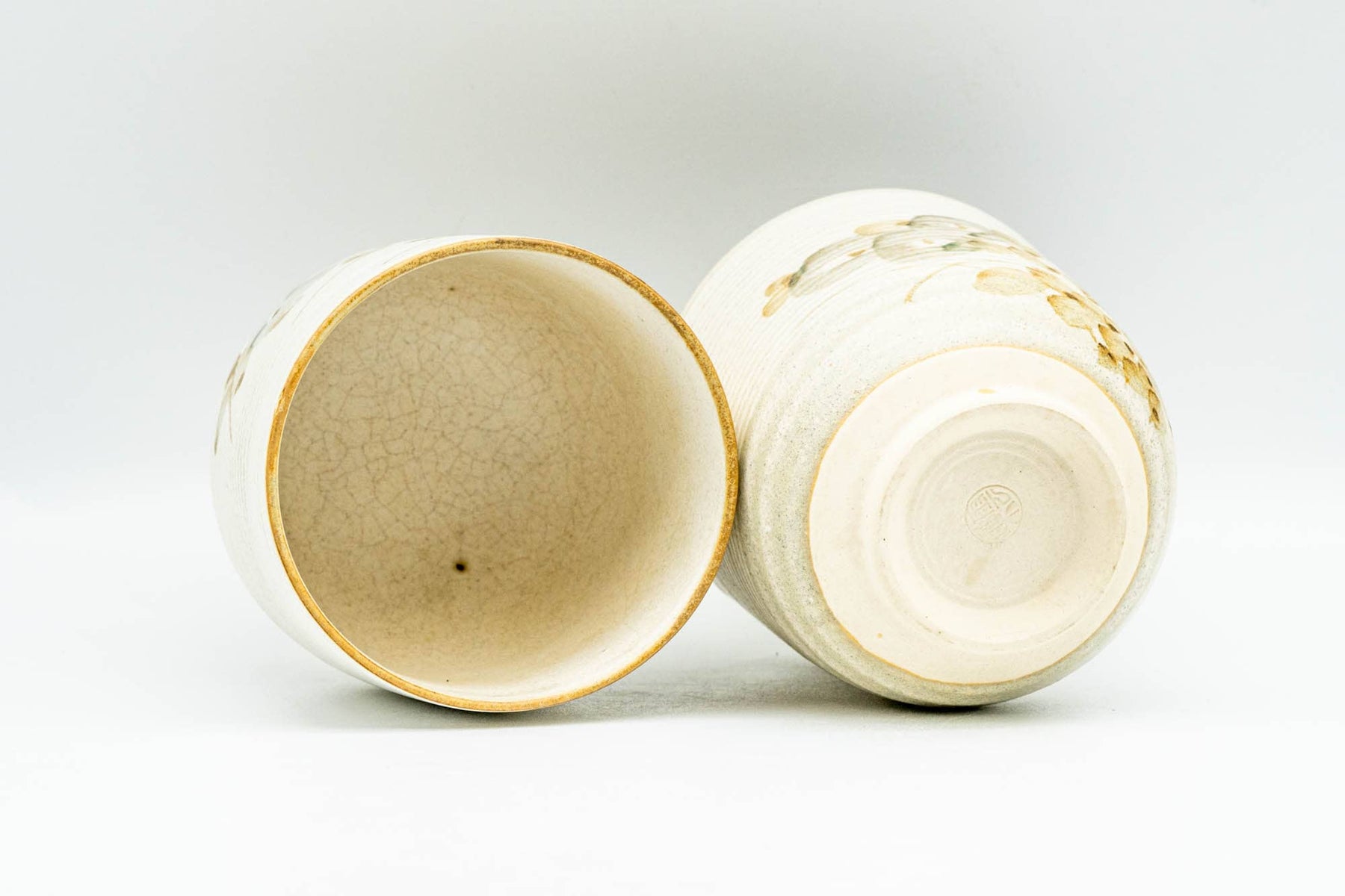 This pair of Kiyomizu-yaki yunomi (teacups) feature a beige glaze decorated with flowers.