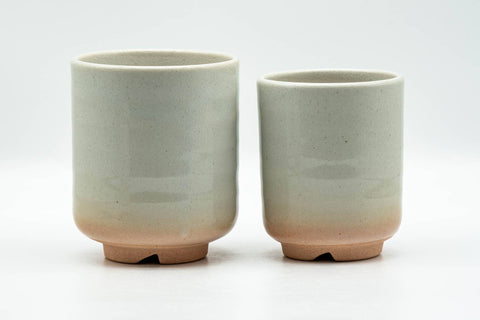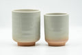 This pair of Hagi-yaki meoto yunomi (teacups) feature a smooth beige glaze. For storage purposes, the smaller teacup fits within the larger.