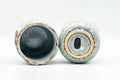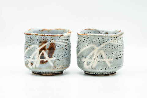 This pair Mino-yaki yunomi (teacups) feature a thick blue shino glaze decorated with abstract white motifs