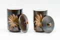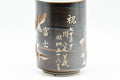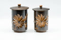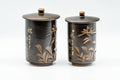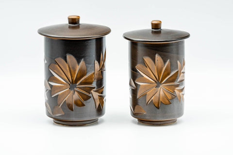 This pair of lidded meoto yunomi (teacups) feature a brown glaze with floral decorations. The cup's lid helps keep dust out and heat in.