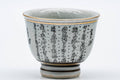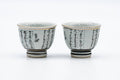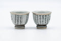 This small pair of Kutani-yaki guinomi (small teacups) features a classic white-grey glaze decorated with gold trim and black calligraphy.